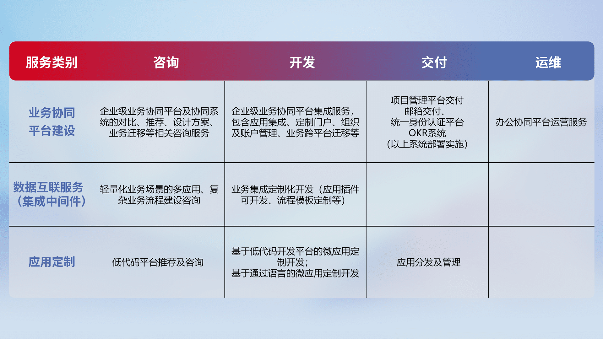 针对钉钉、、、企微、、、IDaas等平台级产品提供产品的规划、、、方案、、、交付、、、、定制化开发等服务,,,,实现如统一协同办公、、、、智能客户服务、、混合会议管理、、智能数据查询、、、等业务场景,,实现数字化转型。。
