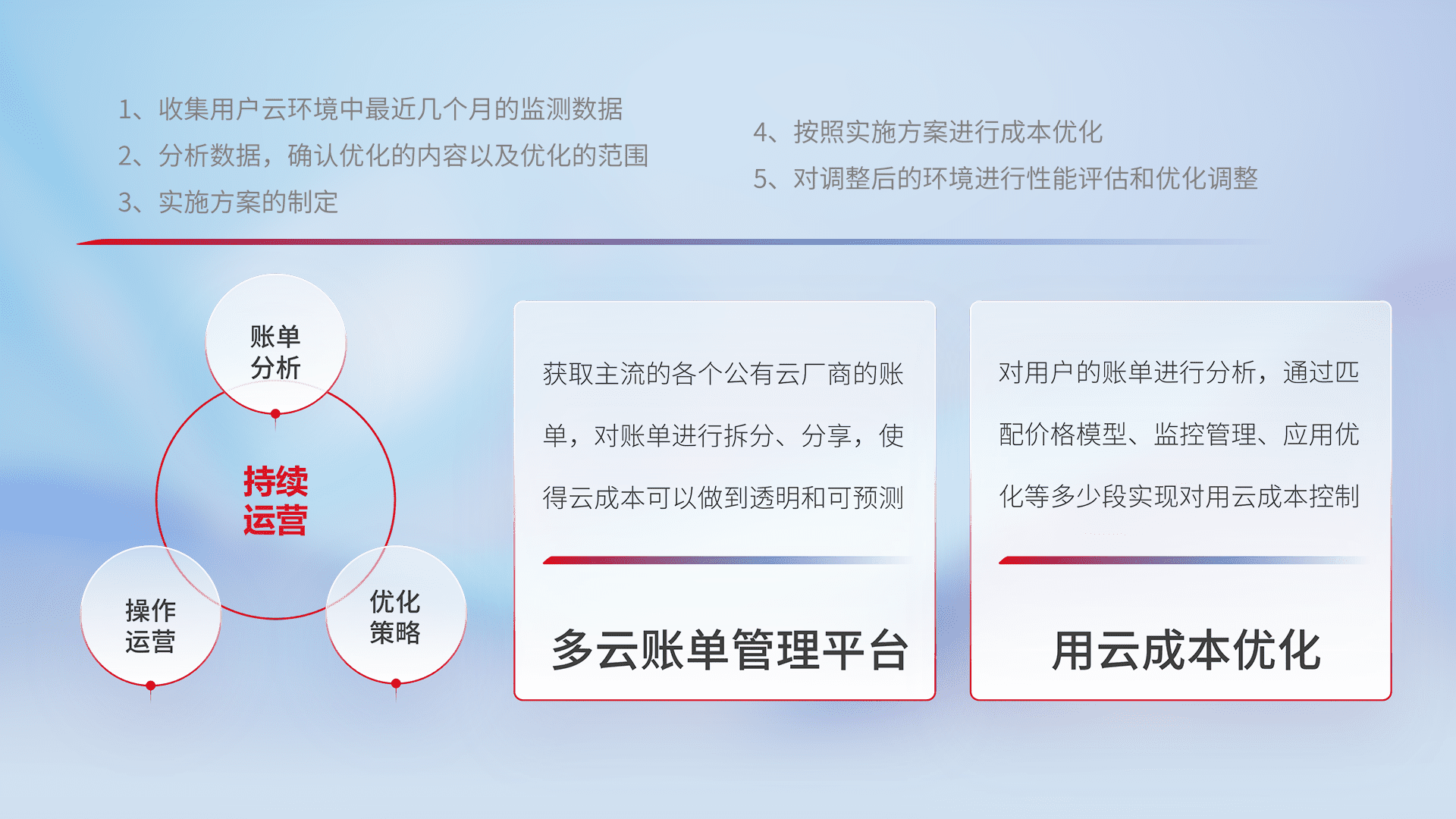 通过多云纳管,,以统一的资源数据模型把客户的云资源进行抽象和封装,,,进而实现对多云资源的统一操作,,,,保障云资源管理的可靠性、、、、稳定性与可用性。。。。量身定制化运维内容,,配置、、、、开发运维、、、、补丁管理、、、、备份、、监控、、认证和访问管理、、审计和日常巡检等,,保障在用云过程中的可靠度,,,稳定度以及高可用率。。。。