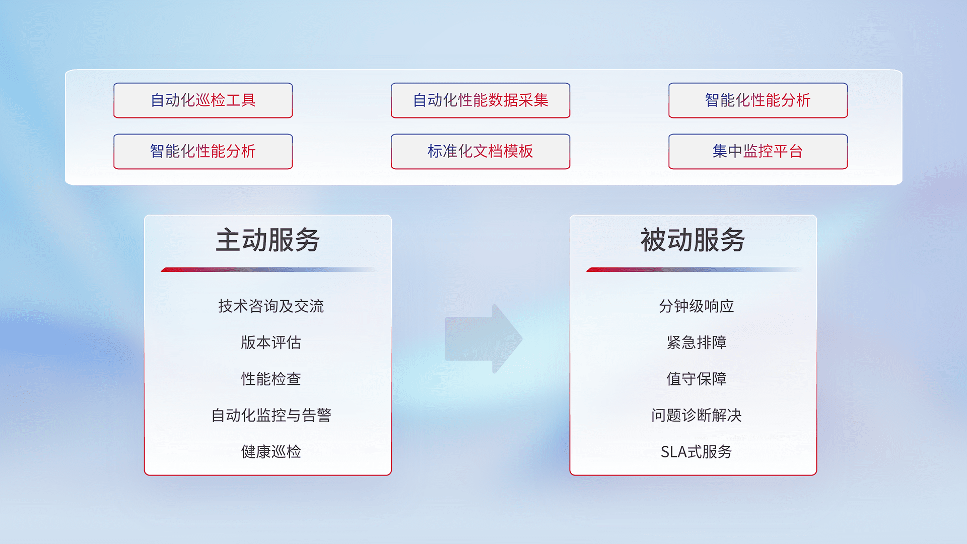 智能化工具和标准化文档,,,保障服务质量,,,提供主动服务(包含技术咨询、、、版本评估、、性能检查、、、自动化监控与告警、、健康巡检)和被动服务包含(分钟级响应、、、紧急排障、、、值守保障、、、问题诊断解决、、、SLA服务)。。。